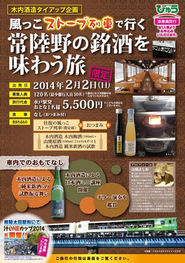 JR水郡線を期間限定で走る『風っこストーブ列車』の中で、木内酒造の酒々と素敵なギターの生演奏を味わうことができるツアーを催行します! 到着地の常陸太田駅前では「汁ONEカップ2014」も開催! 風情溢れるストーブ列車で、ほっこりしたひとときを!