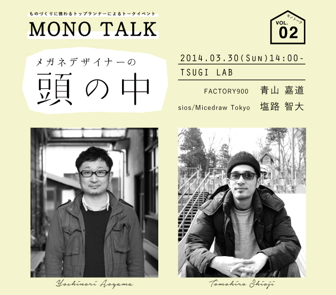 2回目の開催となるMONO TALK。今回のゲストスピーカーは、メガネデザイナーの青山嘉道さんと塩路智大さんです。